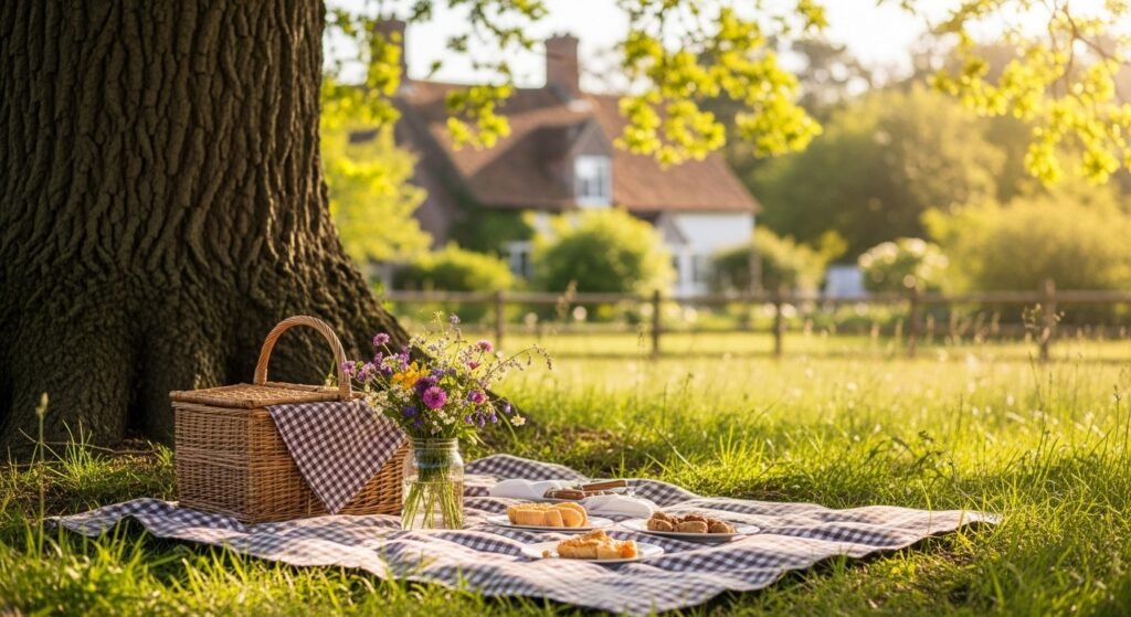 • Gingham Picnic Blanket – A classic checkered blanket with water-resistant backing, ideal for outdoor picnics and garden reading.