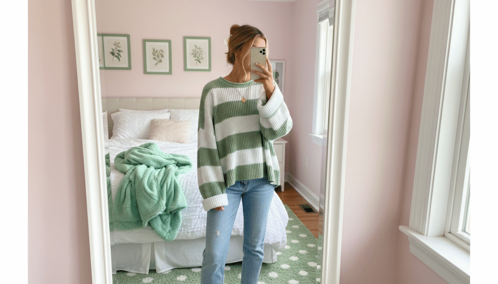 - Y2K Graphic Crewneck Sweatshirt – This trendy oversized pullover features aesthetic Y2K graphics in preppy colors, perfect for casual outfits and achieving that effortless cool-girl style.