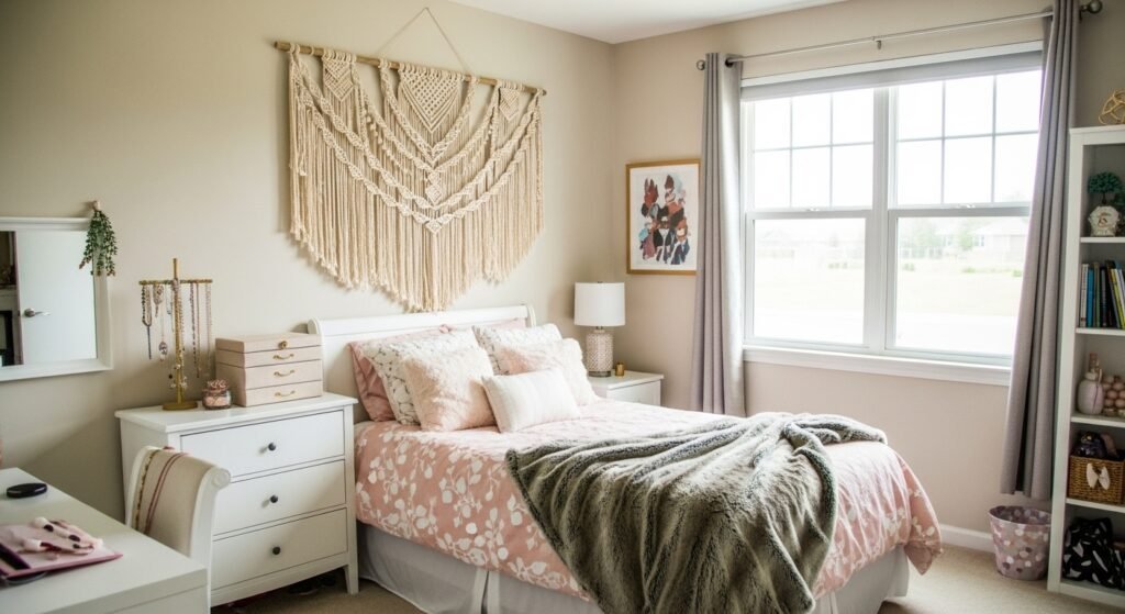 - Macrame Wall Hanging – This boho-inspired wall hanging adds texture and visual interest to bedrooms, creating a relaxed, artistic vibe without requiring any tools or installation expertise.