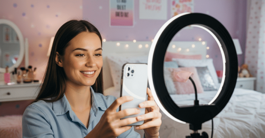 - 10″ Selfie Ring Light with Tripod Stand – A ring light with adjustable tripod, ideal for enhancing facial lighting in videos