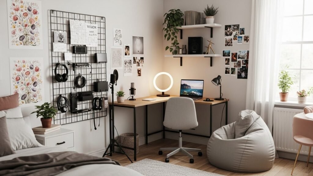 • USB Microphone – A versatile USB microphone offering broadcast-quality audio for podcasting, voiceovers, and streaming. Perfect for content creator room setup ideas where plug-and-play simplicity matters.